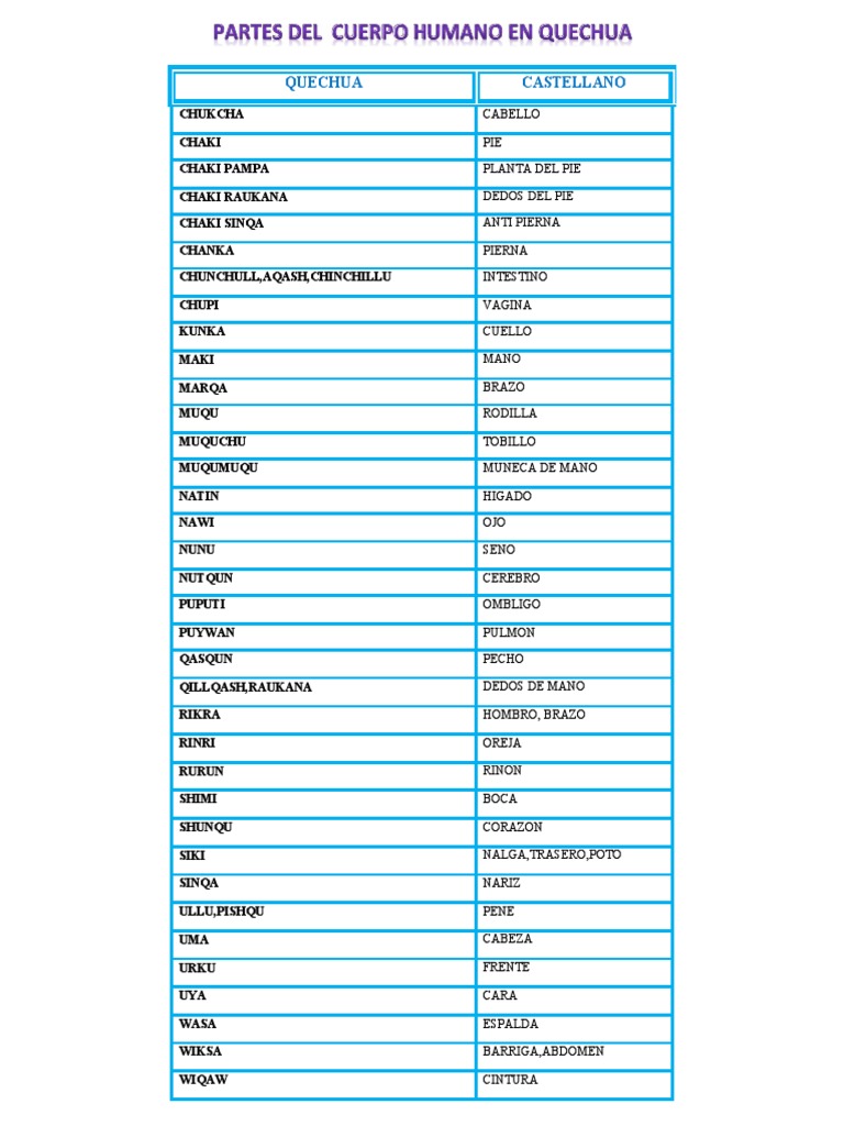 Todas Las Partes Del Cuerpo Humano En Quechua Y Traduccion